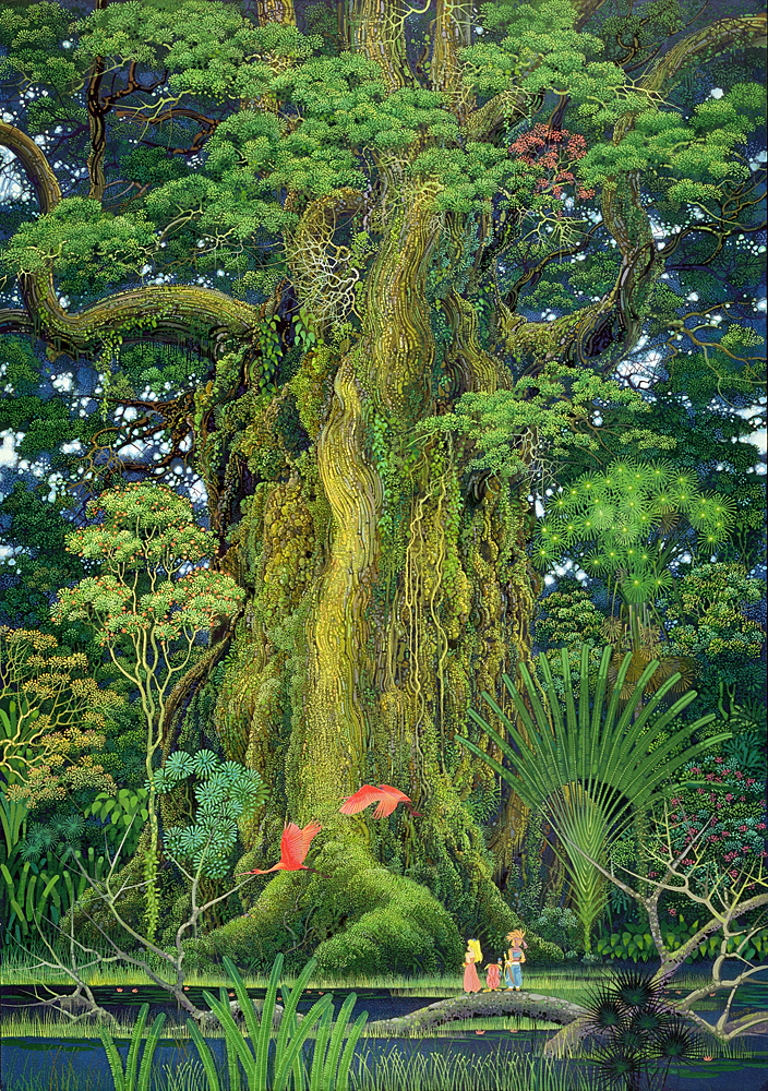 It’s easy to settle on the most striking part of the box art being Isono’s excruciatingly detailed line work. Every leaf on every fern has some contrast of light and colour distinguishing it from the rest. The shroud of moss climbing up the central tree feels at once soft and clearly defined. There are no shortcuts. Every part of the scene is practically buzzing. And yet it dodges any sense of being easy to pin down thanks to a pervasive anti-realism.